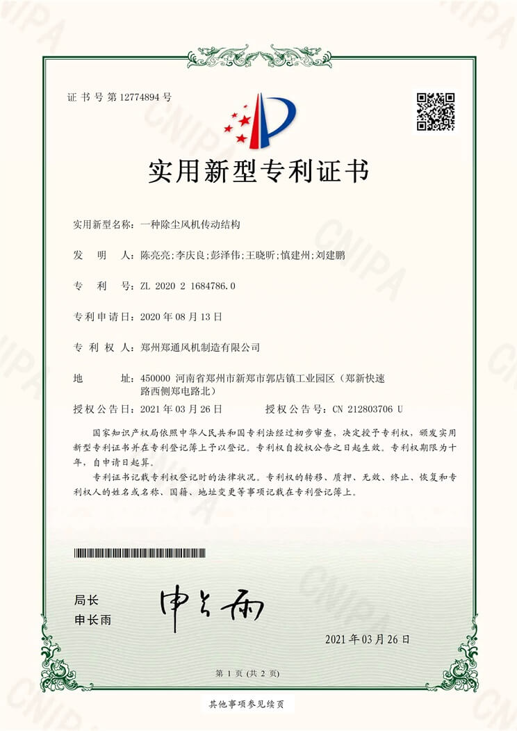 一種除塵風(fēng)機(jī)傳動結(jié)構(gòu)實用新型專利證書