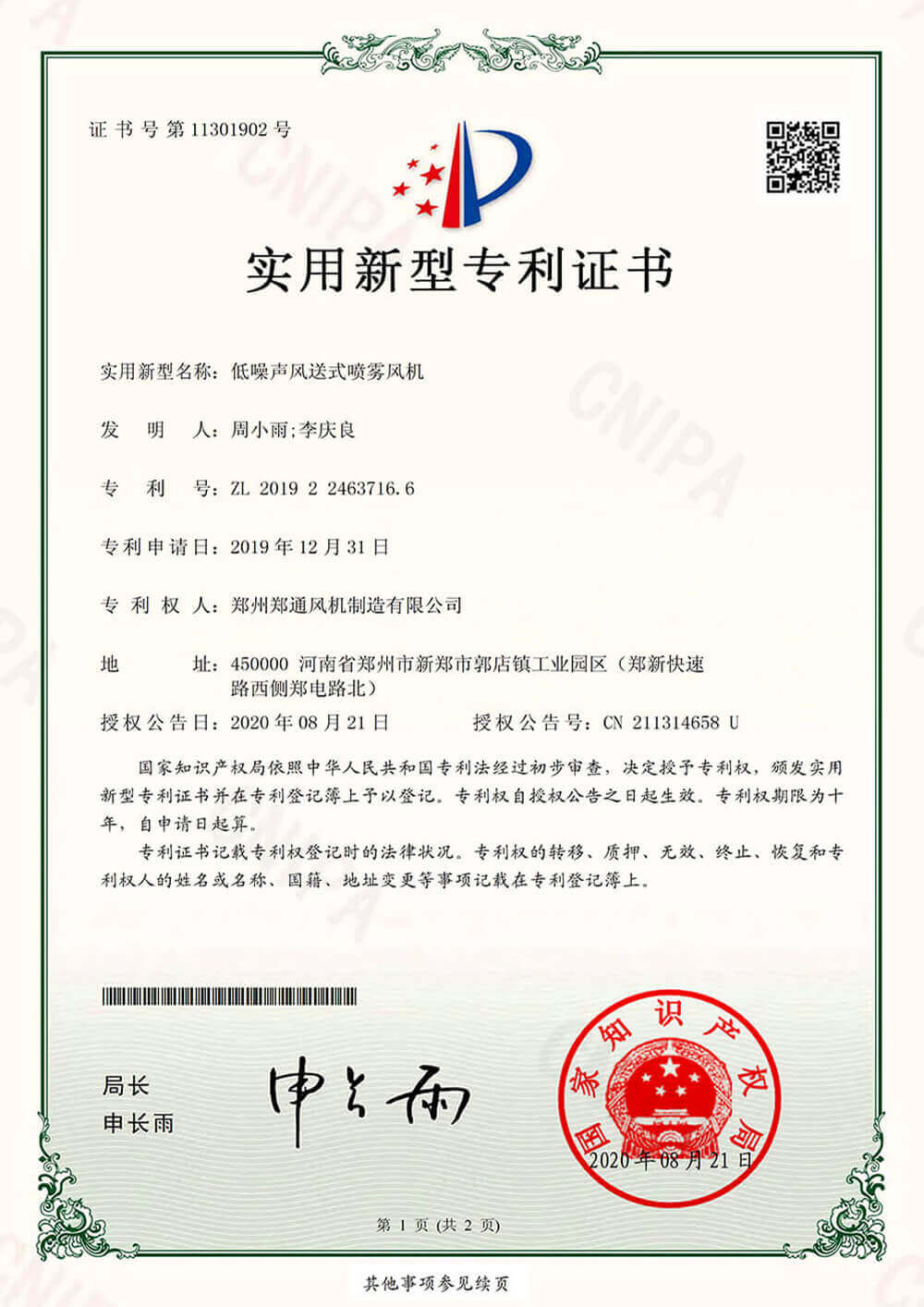 實用新型專利證書1低噪聲風(fēng)送式噴霧風(fēng)機(jī)實用新型專利證書