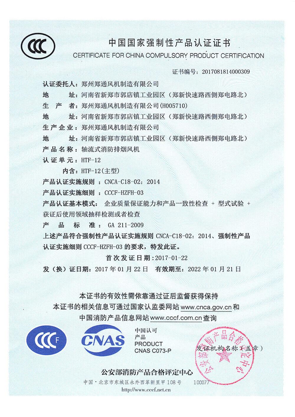 鄭通風(fēng)機(jī)主要產(chǎn)品包括:高壓風(fēng)機(jī)、不銹鋼風(fēng)機(jī)、消防排煙風(fēng)機(jī)、防腐防爆風(fēng)機(jī)、廚房排油煙風(fēng)機(jī)、玻璃鋼風(fēng)機(jī)、鍋爐引風(fēng)機(jī)、軸流風(fēng)機(jī)、柜式離心風(fēng)機(jī)、鍋爐引風(fēng)機(jī),產(chǎn)品通過ISO9001、ISO14001、ISO45001國際標(biāo)準(zhǔn)化組織制定的質(zhì)量管理體系認(rèn)證,部分產(chǎn)品通過了3C認(rèn)證和國家防爆電器產(chǎn)品質(zhì)量監(jiān)督檢驗中心認(rèn)證。